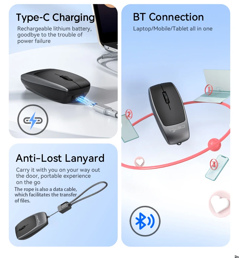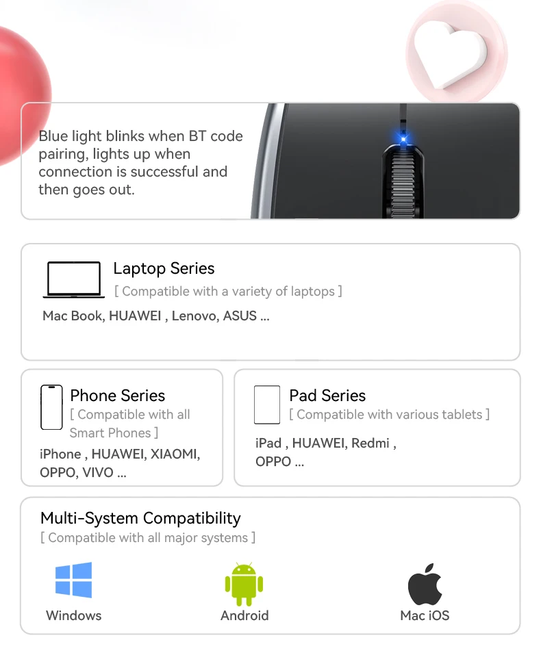 Step 2: Enable Bluetooth on your device (tablet/PC/phone), navigate to "BT" settings, and connect to "BT5.1Mouse". The blue light turns off once paired.